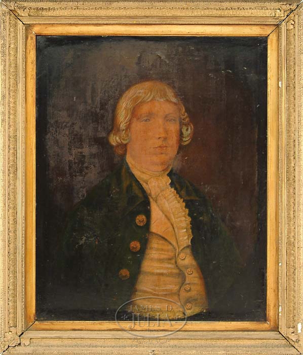 UNSIGNED (Early 19th Century) PORTRAIT OF A GENTLEMAN. Oil on paper mounted on canvas half portrait of a gentleman in a green coat with vest and cravat. The middle age man with curly blonde hair against a dark brown background. Appears to be unsigned. Housed in what probably is its original repainted gold gesso decorated frame with gold liner. PROVENANCE: From a Belgrade Lakes, Maine home. SIZE: 29-1/2” x 23-3/4”. CONDITION: In need of cleaning and restoration with some small cracks and excessive dirt. 9-29982 (200-500)