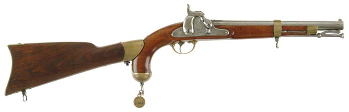 SPRINGFIELD MODEL 1855 PISTOL CARBINE. Cal 58. SN 1/12. 12” part oct bbl. Dated “1855” on tail of lockplate and bbl tang under rear sight. No inspector marks. Standard proofmarks. Top of butt cap is stamped “1”, lower tang of buttstock is stamped “12”. Brass tag has the number “SA066” and there is a claim that this is from the William Locke Collection but this pistol is not shown in the catalog of his collection. CONDITION: Metal is bright with light signs of cleaning. Wood has been lightly sanded and varnished. Mechanically fine. 4-30961 FS163 (3,000-5,000)