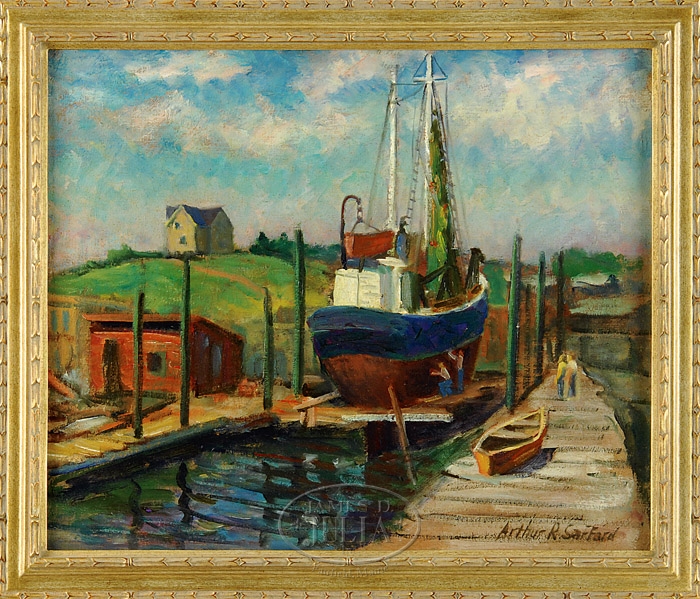 ARTHUR SAFFORD (American, 1900-1988) IN DRY DOCK. Oil on canvas scene shows a large fishing trawler in dry dock being worked on by several men. It stands next to a long wharf with buildings and having a house on hilltop background under colorful sky. Signed lower right “Arthur R. Safford”. Housed in a gilt decorated frame. SIZE: 20″ x 24″. CONDITION: Very good. 9-93020 (300-500)