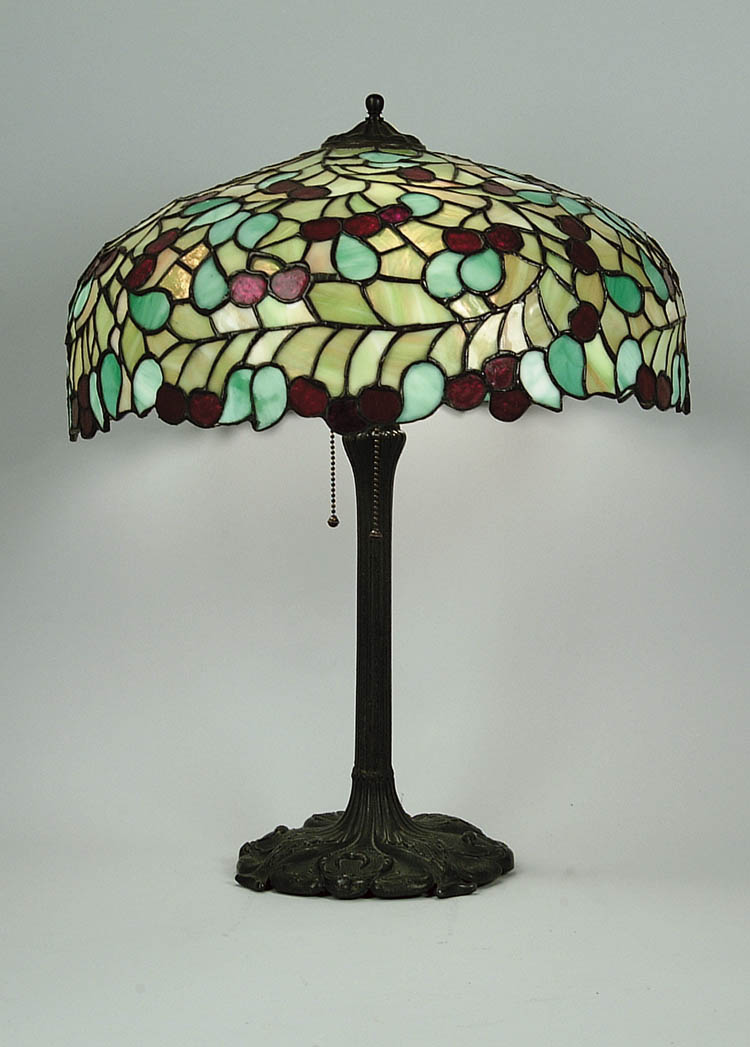 LEADED CHERRY TABLE LAMP. Wonderful table lamp with leaded glass green and amber background panels has all over clusters of cherries and green leaves. Attributed to Chicago Mosaic. Shade rests on sculpted metal base with three sockets. SIZE: Shade is 18″ diameter. Overall height is 22″. CONDITION: Cap has been soldered directly to shade. Some cracked tiles. Base has crack on stem, otherwise good. 5-67468 (3,000-5,000)