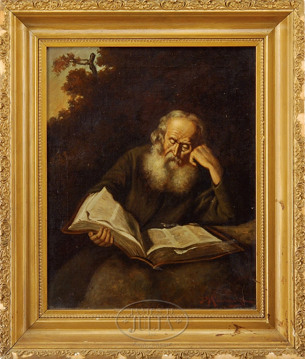 J M KAVINAUGH (American, Early 20th Century) THE LONG READ. Oil on canvas scene shows an elderly man with white beard sitting in an outdoor setting next to a rock that holds a large book which he has open and is reading. Signed lower right “J M Cavanaugh”. Housed in what appears to be its original gesso decorated gold frame which has losses. SIZE: 20″ x 16″. CONDITION: Faint stretcher lines, otherwise very good. 9-92379 (800-1,200)