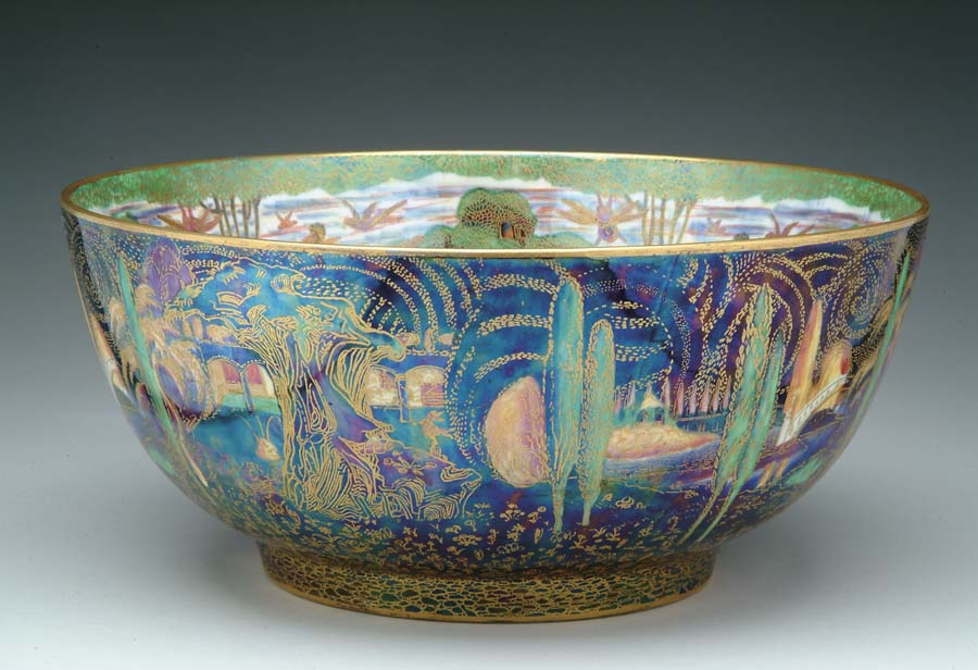 WEDGWOOD FAIRYLAND LUSTRE BOWL. Outstanding Imperial bowl is decorated with Poplar Tree pattern on the exterior and Woodland Bridge on the interior. Marked on the bottom with Portland vase, “Wedgwood”, “Made in England” and pattern “Z4968”. SIZE: 10-1/2 in. dia x 4-3/4 in. t. CONDITION: Very good to excellent. 5-60258 (4,000-6,000)