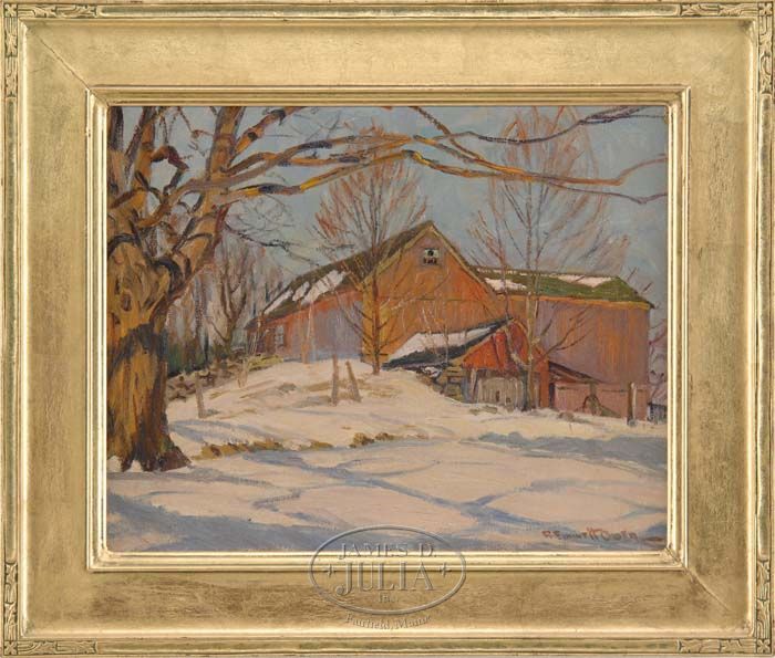 ROBERT EMMETT OWEN (American, 1878-1957) “BERKSHIRE BARN”. Fine oil on canvas Western Massachusetts winter scene shows a connected large red barn with snow covered ground and large maple trees. Late afternoon with a pink hue cast on the white snow. All under a blue sky. Signed lower right “R. Emmett Owen”. Title on reverse of stretcher. Housed in a good gilt carved arts & crafts style frame. SIZE: 16” x 20”. CONDITION: Very good. 9-73380 LG (5,000-8,000)