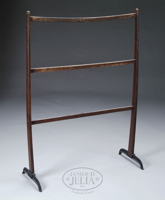 INTERESTING WOOD AND IRON DRYING RACK. The tapered rounded top side posts have mortised and tendoned three slats and cast iron trestle type feet. First half of the 19th Century and possible of Shaker design. SIZE: 37-1/2” h x 28” w. CONDITION: Very good with nice patina. 9-28269 (200-400)