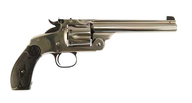 SMITH & WESSON NEW MODEL #3 TARGET REVOLVER. Cal. 38-44. Nickel finish, 6-1/2” keyhole ribbed bbl, replacement partridge front sight and adjustable rear sight, fitted with 2-pc monogrammed hard rubber grips. Left side of the bbl marked with the caliber. SN 4324. CONDITION: Good, all matching except the grips which are unnumbered. Retains most of a professional re-nickel over a few spots of fine pitting. Grips show moderate wear with the left side faded to chocolate and has a crack in the bottom. Bore is strong with moderate pitting, mechanics are fine. 4-47975 JR64 (Anderson Collection) (500-1,500)