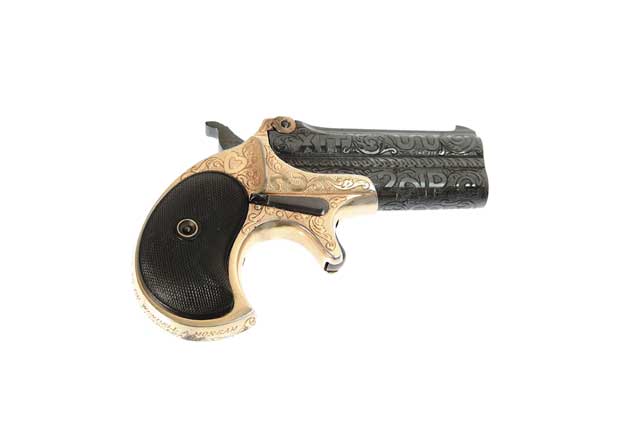 CATTLE BRAND ENGRAVED REMINGTON OVER/UNDER DERINGER. Cal. 41RF. Usual configuration with 3” superposed bbls, blued bbls with gold-plated frame and checkered hard rubber grips. Full coverage Texas cattle brand engraving, apparently by Cole Agee. Back strap has the inscription, “PRESENTED TO DR. WENDELL A. MORGAN / FROM HUGH J. FITZGERALD / AUSTIN, TEXAS 1957”. Bbl hinge is broken on both sides and the bbls are loose. SN 273. CONDITION: Hinge as noted, the bbls retain most of their custom blue and the frame about 95%gold plating with sharp edge wear, a spot of rust on the butt with the plating thin on the butt. Strong, bright bores. 4-48895 JR681 (750-1,250)