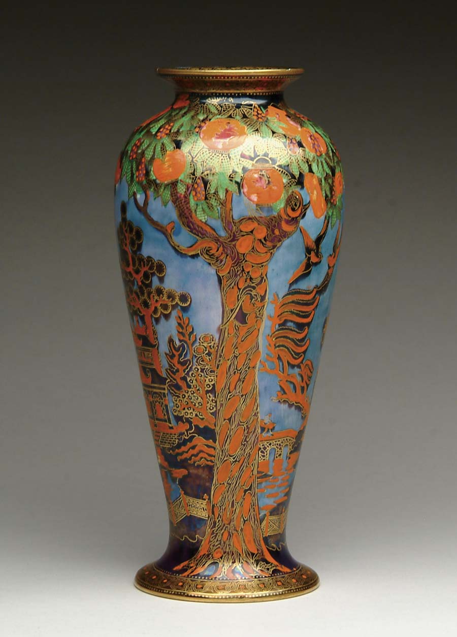 WEDGWOOD FAIRYLAND LUSTRE VASE. Nice Wedgwood vase is done in the Willow pattern with blue background and coral highlights. Signed on the underside Portland vase mark, “Wedgwood”, “Made in England” and “Z5228”. SIZE: 10-1/2 in. t. CONDITION: Vase has been broken and has had amateur repair. 5-61254 (400-600)
