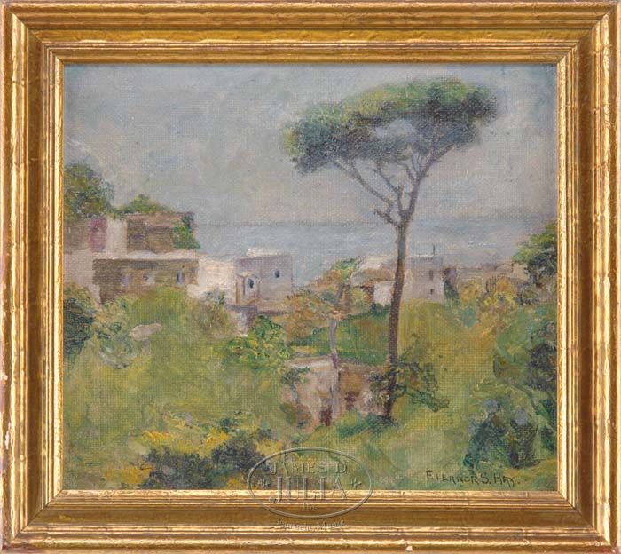 ELEANOR HAY (American 1863-) STUCCO BUILDINGS ON A COASTLINE. Oil on canvas board scene shows several white stucco buildings on the edge of blue water with a single tree in the foreground. Signed lower right “Eleanor S. Hay”. Housed in what appears to be its original gilt molded wood frame. Possibly a California coast scene. SIZE: 10-1/4” x 11-3/4”. CONDITION: Very good. 9-74550 SM (750-1,000)
