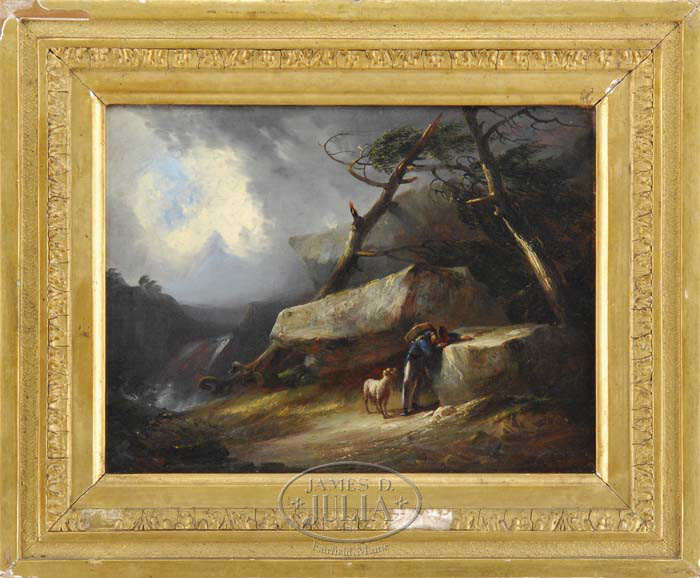 GEORGE L MILLER (American, 19th Century) STOPPING FOR A REST. Oil on canvas scene shows a man in blue and white uniform with green cap wearing a knapsack resting his head and steadying himself on a large rock. A waterfall is seen beyond and gray clouds are breaking showing a spot of blue sky. Signed lower left “G. Miller 1833”. Housed in a gold antique liner. SIZE: 9” x 12”. CONDITION: Relined, craquelure, with minor retouch. Very good. 9-73800 (1,000-1,500)