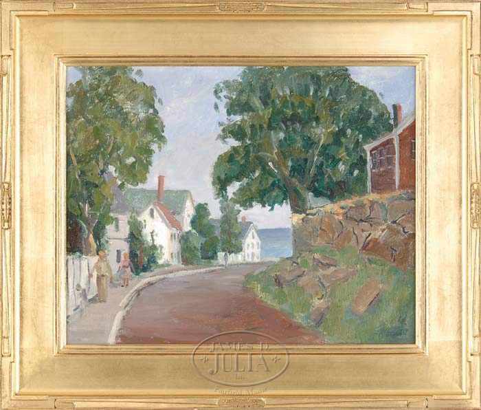 MELVILLE F. STARK (American, 1903-1987) CAPE ANN STREET TO THE OCEAN. Oil on canvas board scene shows a road lined with New England homes leading to blue ocean. Two pedestrians are walking along the sidewalk. Signed lower right “M. Stark”. Back with an Estate stamp and also a stamp certifying the painting by his son. Housed in a fine carved wood arts & crafts style replacement frame. SIZE: 16” x 20”. CONDITION: Very good. 9-70857 (3,000-4,000)