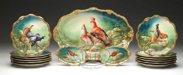 OUTSTANDING FIFTEEN PIECE LIMOGES GAME SET. Artist signed “Laure” the pieces marked by the Coiffe Porcelain Factory (Limoges, France) and the Limoges decorating company. Set consists of: 19” x 12-1/2” platter; twelve 9-1/2” plates; two 7-1/2” x 4-1/2” sauce dishes. Each piece decorated with two birds against a green-blue landscape. The plates are set in pairs having the same birds in mirror image to one another. The outside edges in a heavy gold decoration. An outstanding set. CONDITION: Very good to excellent. 9-73666 (1,500-2,500)