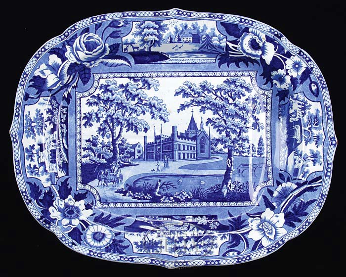 IMPORTANT HISTORICAL BLUE STAFFORDSHIRE “WELL-N-TREE” PLATTER. Mid-19th century. This unmarked example having a center panel depicting a large building of Gothic design on a treed landscape, the foreground with pond, swans, and a couple in a carriage within a wide bold floral border interspersed with four cartouches depicting various rural scenes. SIZE: 20-3/4″ l. x 16″ w. CONDITION: Overall very good, with minor imperfections in glazing, minor surface scratches and roughness to edge. No maker’s marks observed. 9-95202 (900-1,200)