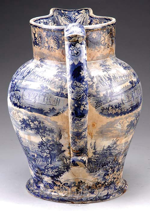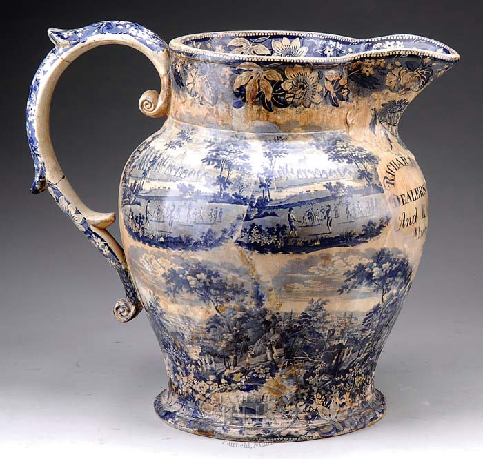 MONUMENTAL BLUE STAFFORDSHIRE TRANSFER-DECORATED SHOP SIGN. Circa 1837. This advertising trade sign in the form of a blue transfer-decorated milk pitcher advertising “RICHARD & JOHN SHAW / DEALERS IN / Glass China / And EARTHENWARE / Abergaveney / 1837″. Decorated overall with two rows of tableaux depicting various scenes, the topmost four scenes of the game of cricket, the lower row four panels of a hilled landscape overlooking a large town, a family group in the foreground observing the town using a telescope, all within wide floral and leaftip borders. LITERATURE: For a comprehensive article discussing the existence of these oversized Staffordshire jugs, see The Magazine Antiques, Jan. 1996, p. 192 ff., titled “Oversized Staffordshire Jugs” by Sharon D. Greene, wherein she stated, “The jug shown in Plate V and Figure 1, advertising a Staffordshire wholesaler, is probably the largest such jug to have survived.” That example measured 24-1/4″ in height. SIZE: 25″ h. x 18″ w. 27″ spout to handle. PROVENANCE: From the Estate of Geraldine Gaba, Scottsdale, AZ. CONDITION: This rare, important example has undergone extensive professional repairs to handle and body and suffers from some brown discoloration overall. 9-94834 (2,000-3,000)
