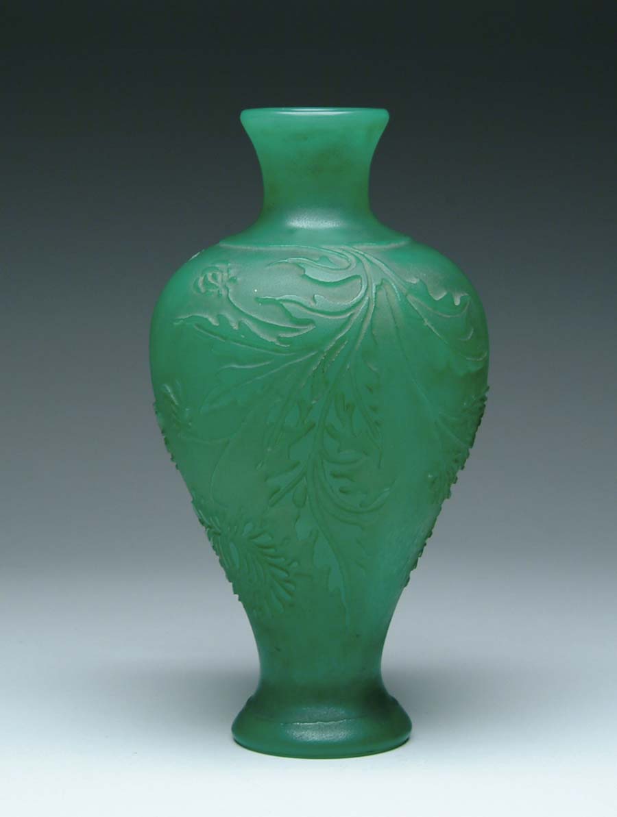 STEUBEN LAMP BASE. Lovely green jade lamp base has deep acid cut back design of stylized leaves and flowers descending from the shoulder. Base is factory drilled at the bottom. SIZE: 12 in. t. CONDITION: Very good to excellent. Note: This is glass only, does not include mounting hardware. 5-61057 (1,000-1,500)