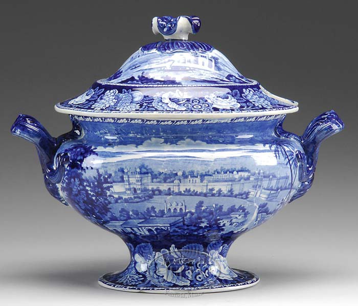 HISTORICAL DARK BLUE STAFFORDSHIRE SOUP TUREEN WITH COVER. Mid-19th century. This fine example by I. Hall & Sons, titled “Palace of the King of Delhi”, part of the Oriental Scenery series, rendered in a rich dark blue glaze. The domed lid with floral knopp finial, fitted to the conforming base; scrolling leaftip double loop handles, raised on oval foot, all with intricate floral borders. Maker’s name and title in underglaze blue mark. SIZE: 11″ h. x 13-1/2″ l. x 8″ w. CONDITION: One small flake on base rim, small flakes interior rim of lid, otherwise very good overall. 9-95200 (800-1,200)