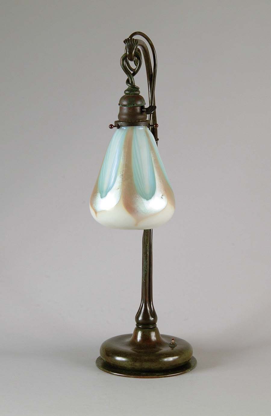 TIFFANY ART NOUVEAU LAMP. Wonderful Tiffany lamp has bronze base with heavy organic form foot supporting twisted stems winding upward to support a hanging socket. Lamp is finished with a wonderful Tiffany shade with light blue pulled feather design outlined in gold iridescence against a creamy white background. Shade is signed “LCT 3164-K”. Base is marked on the underside “Tiffany Studios New York 7818”. SIZE: Shade is 5-1/2” dia x 6-1/2” t. Overall height is 23-1/2”. CONDITION: Base has some patina restoration, otherwise very good. 5-71825 (13,000-15,000)