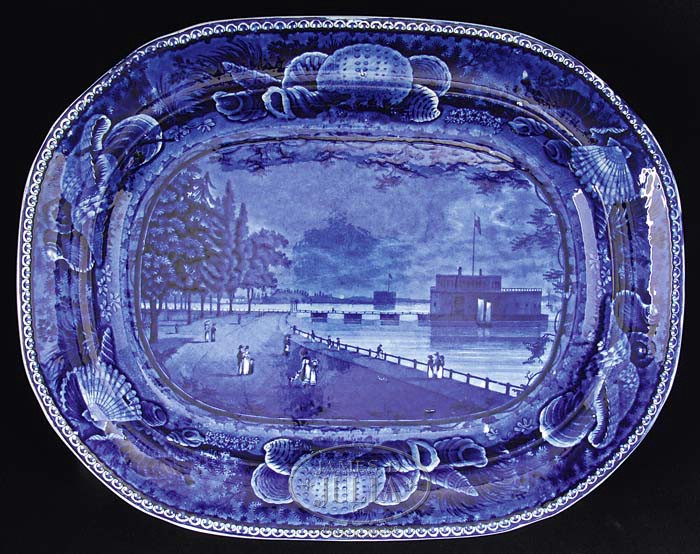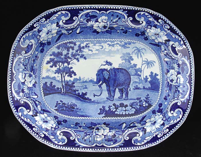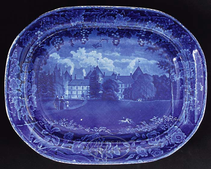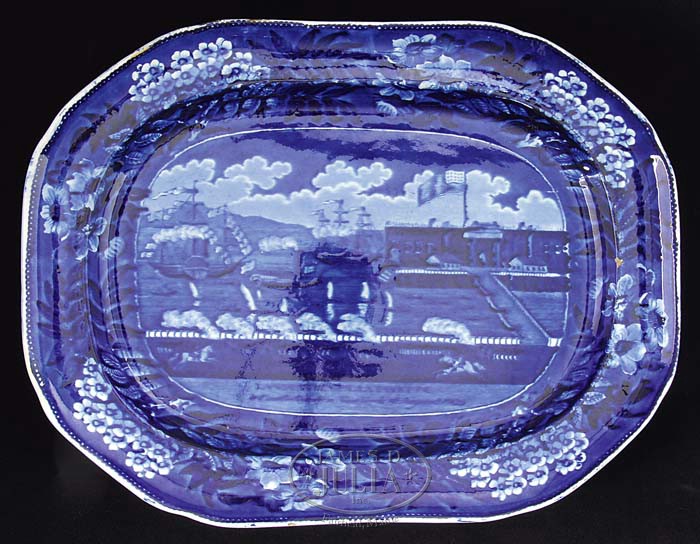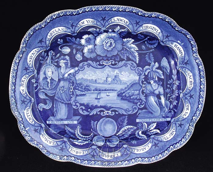 NINE BLUE STAFFORDSHIRE HISTORICAL PLATTERS. Each transfer-decorated, most in dark blue, some in medium-blue, comprising: 1) “Castle Garden Battery, New York”, dark blue with shell border; impressed mark of Enoch Wood & Sons, 18-1/2″ x 14-1/2″. Reference: American Historical Views on Staffordshire China by Ellouise Baker Larsen, 3rd edition, p.14, fig. 16. 2) America and Independence series, dock with large building and ships; impressed mark of James and Ralph Clews, dark blue, 18-1/2″ x 15-1/2″. Reference: Historical Staffordshire, An Illustrated Check-List by David and Linda Arman, p. 13, fig.4. 3) “Southwest View of LaGrange, the Residence of the Marquis Lafayette”, floral and grapevine border, Enoch Wood & Sons, impressed mark “WOOD”, dark blue, 18-3/4″ x 14-1/2″. For detailed description of platter, see American Historical Views on Staffordshire China by Ellouise Baker Larsen, 3rd edition, p. 30; for illustration see Historical Staffordshire, An Illustrated Check-List by David and Linda Arman, p. 84, fig. 203. 4) “The Landing of General Lafayette at Castle Garden, New York, 16 August, 1824″, impressed mark of James and Ralph Clews, dark blue, 17″ x 13”. 5) “Edinburgh”, City View series, Herculaneum Pottery, impressed mark, medium-blue, 16-1/2″ x 13″. For description see Anglo-American China, Part II, by Sam Laidacker, p. 52. 6) “Lake George, State of New York”, dark blue with shell border, Enoch Wood & Sons, impressed mark, 16-1/2″ x 12-3/4″. For detailed description see American Historical Views on Staffordshire China by Ellouise Baker Larsen, 3rd edition, p.18, item 27. 7) “Niagara, from the American Side”, dark blue with shell border, Enoch Wood & Sons, impressed mark, 15″ x 11-3/4″. For description and illustration see American Historical Views on Staffordshire China by Ellouise Baker Larsen, 3rd edition, pp. 19-20, fig. 31. 8) Zoological series, Enoch Wood & Sons, impressed mark, medium-blue; scene depicting Indian ‘driver’ in turban astride an elephant in foreground, lion chasing down an antelope in mid-ground, framed within floral and C-scrolled border, 15″ x 11-3/4″. Reference: Anglo-American China, Part II, by Sam Laidacker, pp. 105-106, WZ 8, 10, or 13. 9) America and Independence series, James and Ralph Clews, impressed mark; scene shows building with flag atop square turret, two small boats in foreground, dark blue, 13″ x 10-1/2″. For title, description and illustration, see Anglo-American China, Part I, by Sam Laidacker, p. 8, C11. PROVENANCE: From the Estate of Geraldine Gaba, Scottsdale, AZ. CONDITION: 1) Very good. 2) Extensive professional restoration to both ends. 3) Glaze chip lower left corner center, moderate wear to center. 4) Small rim chips, underside with crackle, otherwise very good. 5) Fair to good, wear to glaze with abrasion. 6) Entire center of platter restored/resurfaced. 7) Very good overall. 8) Good, with minor imperfections. 9) Good, with considerable surface wear to glazed areas; professional restoration to one-quarter of rim at corner 9-94826 (6,000-9,000)