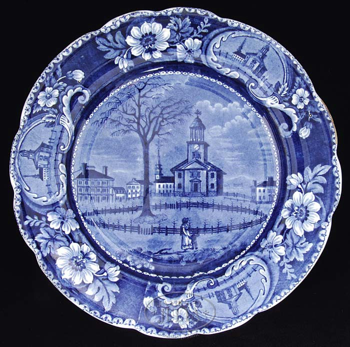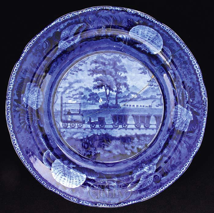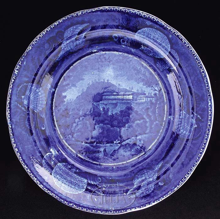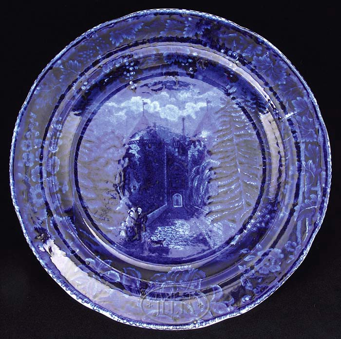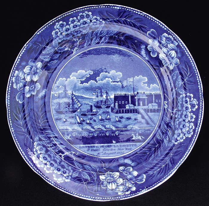 TWELVE STAFFORDSHIRE HISTORICAL BLUE PLATES. 2nd quarter 19th century. Group is comprised of twelve blue transfer-decorated dinner plates: 1) La Grange, the Residence of the Marquis Lafayette, Enoch Wood & Sons. 2) The Baltimore & Ohio Railroad (level), shell border, circular center, Enoch Wood & Sons. 3) Landing of General Lafayette at Castle Garden, New York, 16 August 1824, impressed Clews mark. 4) Pine Orchard House, Catskill Mountains, shell border, underglaze blue mark with title, impressed E. Wood & Sons. 5) “Mitchell & Freeman’s China & Glass Warehouse, Chatham Str Boston”, incised William Adams mark, title in underglaze blue; reference Anglo-American China, Part I, by Sam Laidacker, p. 3, plate A-2. 6) “Bank of the United States, Philadelphia” with spread eagle border, Joseph Stubbs, unmarked, title in underglaze blue; reference Historical Staffordshire, An Illustrated Check-List by David and Linda Arman, p. 119, fig. 321. 7) “Exchange Baltimore” with fruit and flower border; Henshall, Williamson and Company, title in underglaze blue; reference Historical Staffordshire, An Illustrated Check-List by David and Linda Arman, p. 128, fig. 338. 8) New York from Brooklyn Heights by W. G. Wall Esq. New York, floral border, Andrew Stevenson incised mark, title in underglaze blue; reference Historical Staffordshire, An Illustrated Check-List by David and Linda Arman, p. 150, fig. 406. 9) City Hall New York, Beauties of America series, floral border, J & W Ridgway. 10) Park Theatre New York, acorn and oak leaf border, title in underglaze blue, unmarked Stevenson and Williams; reference Historical Staffordshire, An Illustrated Check-List by David and Linda Arman, p. 134, fig. 357. 11) Boston State House, flower and leaf border, impressed John Rogers and Son mark; reference Historical Staffordshire, An Illustrated Check-List by David and Linda Arman, p. 161, fig. 442b. 12) Winter View of Pittsfield, Mass., Pittsfield elm, title in underglaze blue, floral border with medallions, Clews underglaze blue and impressed mark; reference Historical Staffordshire, An Illustrated Check-List by David and Linda Arman, p. 22-23, fig. 33. SIZE: Each 10″ dia. PROVENANCE: From the Estate of Geraldine Gaba, Scottsdale, AZ. CONDITION: 1) Very good overall, minor crazing and discoloration. 2) Major crack through midpoint. 3) Very good overall, with minor glazing imperfection along rim edge. 4) Very good overall, with minimal surface scratches. 5) Good overall, rich colors, a hairline crack extending in from edge to foot rim. 6) Very good medium blue overall, even wear to glaze, two fine hairlines at 12:30 and 2:00 on edge to base rim. 7) Good medium blue color, hairline spider cracks with discoloration on back of plate below title, otherwise good. 8) Very good overall, some wear to blue glazing along interior edge of plate, similar wear along base rim with minor surface scratches. 9) With old repaired damages at 3:00 and 5:00 along edge, overall wear and staining to back of plate, otherwise color good. 10) Very good overall, good medium blue color. 11) Very good overall, strong medium blue color, some minor scratching in glaze surface. 12) Good overall, with minor discoloration to underside, several shallow chips around foot rim. 9-94832-1 (1,500-2,500)