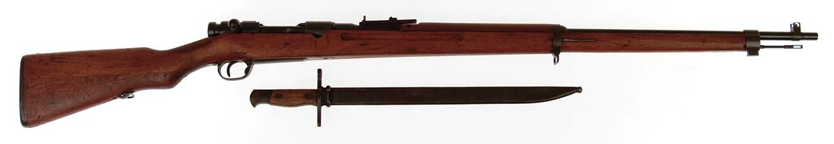 *JAPANESE TYPE 38 ARISAKA MILITARY RIFLE. Cal. 6.5 Jap. SN 84389. Standard production Arisaka with matching numbered bolt and bayonet with scabbard. It has 31-1/2″ bbl with usual sights, short upper hand guard and spliced 1-pc stock with sling swivels. CONDITION: Fine to very fine. Bbl retains about 90% orig blue and the receiver about 85% blue with the mum having been ground and the dust cover missing. Wood is sound with a couple of gouges and usual handling & use marks retaining most of a light refinish. Mechanics are fine, bright shiny bore. Bayonet has a couple of dents in the scabbard with some light surface rust. Blade is clean, lightly sharpened with about 70% orig blue. 4-54276 (150-250)