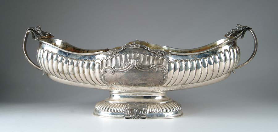 STERLING SILVER CENTERPIECE. Huge sterling center bowl has ribbed design body and two handles that terminate in sterling silver flowers. Interior of the bowl has gold wash. Bowl is stamped on bottom “CK 925”. Piece weighs over 164 troy ounces. SIZE: 34” l x 12” w x 13” t. CONDITION: Very good to excellent. 5-71272 (4,000-6,000)