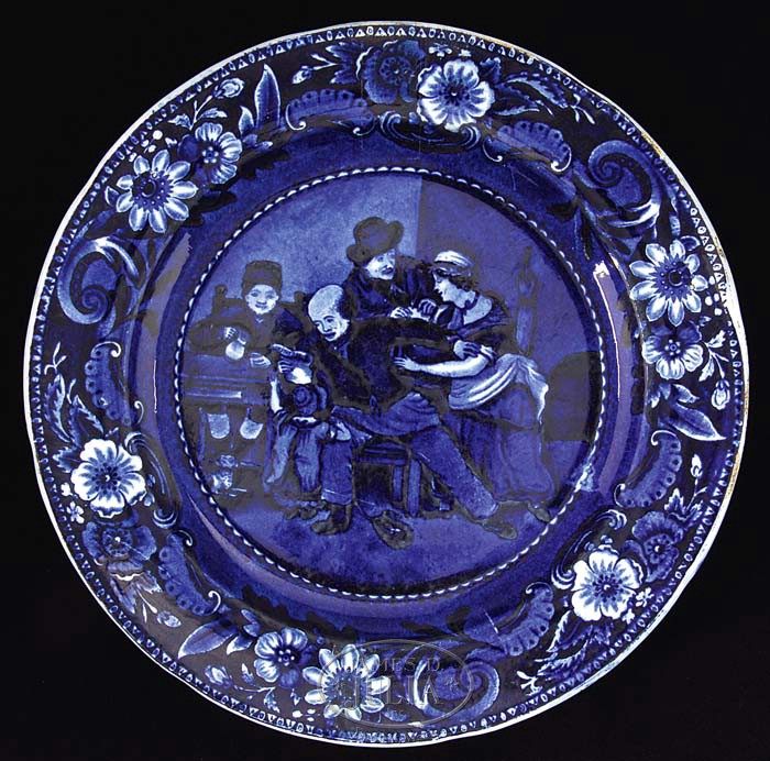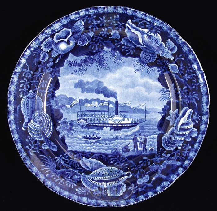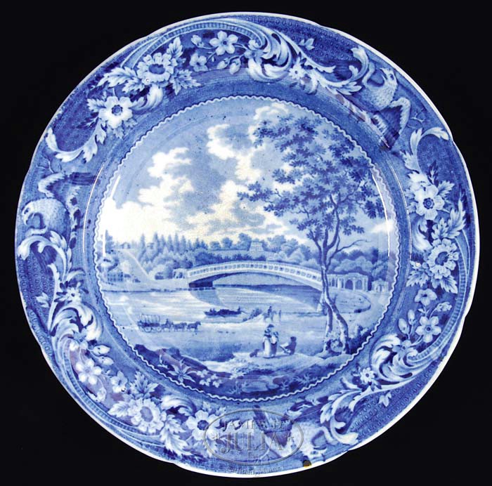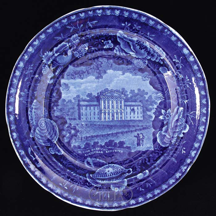 THIRTEEN HISTORICAL STAFFORDSHIRE BLUE PLATES. Second quarter 19th century. 1) “Winter View of Pittsfield, Mass”, 8-1/2″ plate, underglaze blue and impressed Clews mark. 2) “The Valentine” from Wilkie’s designs, 8-1/2″ plate, impressed Clews mark; reference Historical Staffordshire, An Illustrated Check-List by David and Linda Arman, p. 44, plate 93. 3) “Nahant Hotel, near Boston”, 8-1/2″ plate, spread eagle border; reference Historical Staffordshire, An Illustrated Check-List by David and Linda Arman, p. 123, plate 328. 4) America and Independence series, 8-1/2″ plate, building with sheep on lawn, States border, impressed Clews mark; reference Historical Staffordshire, An Illustrated Check-List by David and Linda Arman, p. 14, plate 5. 5) “Upper Ferry Bridge over the River Schuylkill”, titled in underglaze blue, 8-3/4″ plate, spread eagle border, unmarked Stubbs; for example of design see Historical Staffordshire, An Illustrated Check-List by David and Linda Arman, p. 124, plate 332. 6) “Chief Justice Marshall, Troy”, 8-1/4″ plate, shell border, unmarked Enoch Wood & Sons; reference Historical Staffordshire, An Illustrated Check-List by David and Linda Arman, p. 58, plate 127. 7) “Gilpins Mills on the Brandywine Creek”, titled in underglaze blue, 9-1/4″ plate, shell border, impressed Enoch Wood mark. 8) “Transylvania University, Lexington”, titled in underglaze blue, 9-1/4″ plate, shell border, unmarked Enoch Wood & Sons; reference Historical Staffordshire, An Illustrated Check-List by David and Linda Arman, p. 77, fig. 185. 9) “Peace and Plenty”, 9″ plate, scrolling floral border, impressed Clewes mark; reference Historical Staffordshire, An Illustrated Check-List by David and Linda Arman, pp. 23-24, fig. 34. 10) “Commodore MacDonough’s Victory”, 9″ plate, shell border, irregular center; impressed Enoch Wood & Sons mark. 11) “The Baltimore & Ohio Railroad” (incline), titled in underglaze blue, 9″ plate, impressed Enoch Wood & Sons mark; reference Historical Staffordshire, An Illustrated Check-List by David and Linda Arman, p. 76, fig. 182. 12) “Hospital, Boston”, titled in underglaze blue, 9″ plate, vine border, Ralph Stevenson and Williams, unmarked; reference Historical Staffordshire, An Illustrated Check-List by David and Linda Arman, p. 141, fig. 378. 13) “Marine Hospital, Louisville, Kentucky”, 9″ plate, shell border, Enoch Wood & Sons impressed mark; reference Historical Staffordshire, An Illustrated Check-List by David and Linda Arman, p. 61, fig. 137. SIZE: As noted above. PROVENANCE: From the Estate of Geraldine Gaba, Scottsdale, AZ. CONDITION: 1) Crack running through midpoint, roughness to edge. 2) Deep color, wear to glaze, chip on rim. 3) Good overall, good medium blue. 4) Large chip outer edge, otherwise good. 5) Good medium blue with slight crackle in glaze. 6) Good overall, hairline crack in base 7) Strong dark color, scratches in glaze, hairline crack in edge at 8:00. 8) Strong medium blue color, good overall. 9) Very good overall. 10) Good overall with scratches in glaze. 11) Very good overall, minor surface scratches in glaze. 12) Surface scratches and crackle in glaze, rich dark blue, otherwise very good. 13) Surface scratches in glaze, crackle and slight discoloration beneath. 9-94832-2 (1,500-2,500)