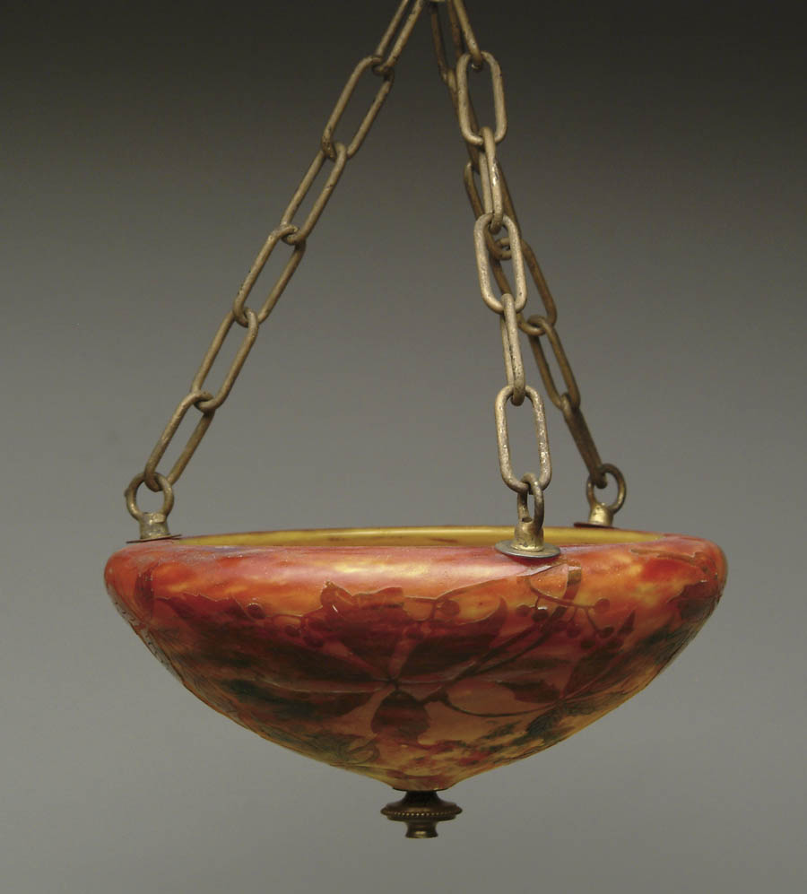DAUM CAMEO PLAFONNIER. Acid-etched with leaf and berry decoration. Ochre on orange mottled background. Signed in cameo “Daum Nancy”. SIZE: 11″ dia. CONDITION: Very good to excellent. 5-62372 (2,200-2,600)
