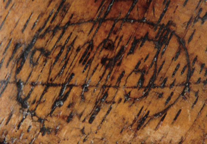 SAVAGE CIVIL WAR NAVY REVOLVER WITH HOLSTER. SN 477. Cal. 36. 7-1/8” oct bbl. Standard 3-line marking on top strap. Cartouches are visible on both sides of the grips. There are inspector marks on various parts. Loading lever and some screws have been replaced. Black leather holster is formed to cover this revolver to the base of the trigger guard. The initials “J. H” are carved in the top flap. There is a single belt loop on the reverse attached with copper rivets. Tie down strap and tip of the flap are missing. CONDITION: Gray patina with light pitting overall. Traces of orig blue in the grooves on either side of the loading lever assembly. Mechanically functional, but needs adjustment as the cylinder does not revolve far enough. Grips are worn at the base and have numerous dents and dings. Right panel is repaired at the top. Holster is scuffed and flaked, mostly around the flap. 4-58301 FS27 (2,250-3,250)