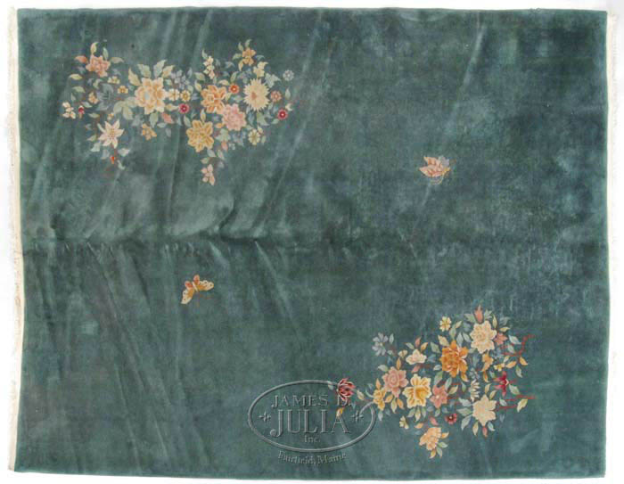 FOUR CHINESE RUGS. All matching. Last half of the 20th Century. Each with a green background and decorated with floral sprays and butterflies. SIZES (without fringe): 11’8” x 8’11”; 11’6” x 9’; 5’8” x 4’1”; 5’9” x 2’1”. CONDITION: Generally good, shows use with some spot stains. Largest rug has one patch to corner area. 9-73313; 73314 (500-1,000)
