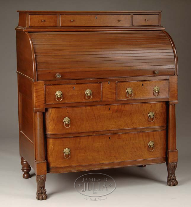 CLASSICAL FIGURED MAPLE TAMBOUR DESK. Interesting roll front tambour desk having a three drawer deck top with curly maple drawer fronts. C-roll desk lid. Nice interior fitted with five drawers, two document drawers, a tambour front center cabinet and pigeon holes. A pullout writing area. All over two split drawers over two long drawers, each having birds eye maple drawer fronts. Each fitted with double lion brasses and flanked by three quarter round tapered columns ending in carved paw feet. Early 19th C. SIZE: Working h 31”; total h is 48-1/2” x 40-1/2” w x 24” d. CONDITION: Very good. 9-70618 (1,200-1,600)