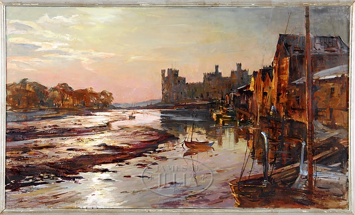 MARIAN WILLIAMS (American, 1912-2001) LOW TIDE AT SUNSET. Oil on canvas scene shows low tide on a tidal river with moored sailboats, a dock area with large buildings ending in a large castle type fort. Signed lower right. Housed in a silvered gilt wood frame. SIZE: 26″ x 44-3/4″. CONDITION: Some craquelure and inpainting. Good. 9-93021 (400-800)