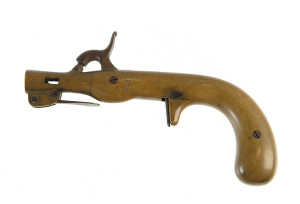 U.S. NAVY MODEL 1861 SIGNAL PISTOL. Marked “ORD.DEPT. / U.S.N.Y.W. / 1871 / anchor / F.M.R.” on the left side of the frame behind the hammer. CONDITION: Very good to fine with dark patina on the brass and light surface rust on the iron parts. Action is fine. 4-49307 FS199 (1,000-1,500)