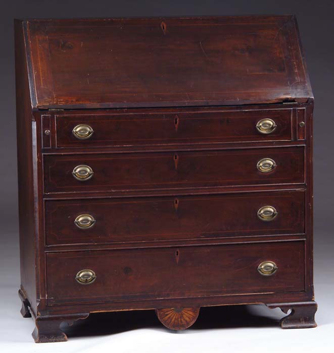 INLAID FOUR DRAWER SLANT LID MAHOGANY CHIPPENDALE DESK. Of Pennsylvania origin, 18th Century. The slant lid desk having four graduated drawers with inlaid escutcheons and line inlay drawer fronts. Original oval brasses. The lid with similar line inlay opens to reveal a ten drawer six cubbyhole and two document drawer interior. Each drawer with decorative line inlay. The cubbyholes with carved sections. The base having a inlaid drop fan at center and short Ogee bracket feet. PROVENANCE: From a fine New Hampshire home. SIZE: 43-1/2” h x 39”w x 20-1/2”d. CONDITION: An old dark finish. The lid, presently not attached, has breaks near hinges and in need of repair at hinge joints. Otherwise good. 9-72774 (2,000-4,000)