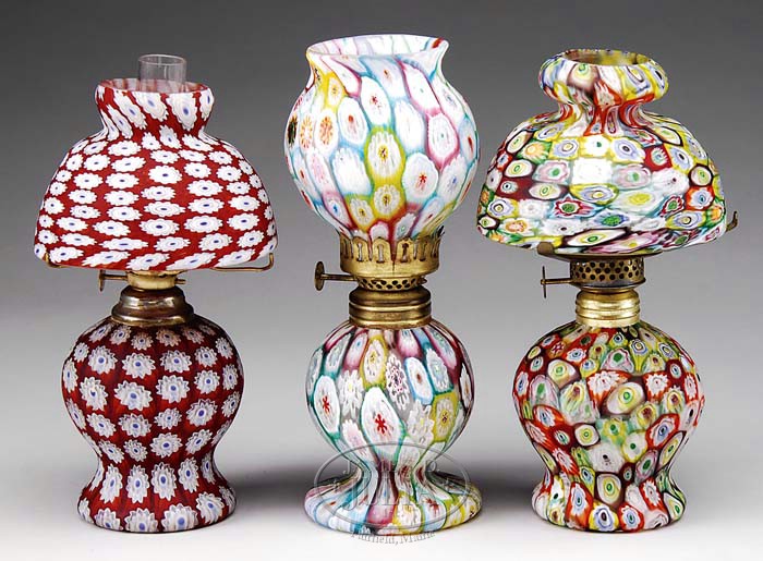 THREE MILLEFIORI MINIATURE LAMPS. Color combinations include red and blue, pastel combination and yellows, blues and greens. Multiple burner styles. SIZE: 7-1/4″ t to 7-3/4″ t. CONDITION: Very good to excellent. 5-67088 5-67089, 5-67090 (300-500)