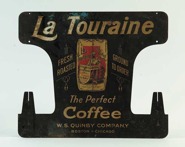 LA TOURAINE COFFEE STRING HOLDER Flat two-sided hanging string holder decorated pouch with Arab man from the W.S. Quinby Co., Boston and Chicago. Black painted tin with yellow text reading “La Touraine–The Perfect Coffee, Fresh Roasted, Ground to Order.” Two integral mounts for spools. SIZE: 20″ w x 17″ h. CONDITION: One of two identical sides displays better, various scratches, generally good. 1-622 (200-400)