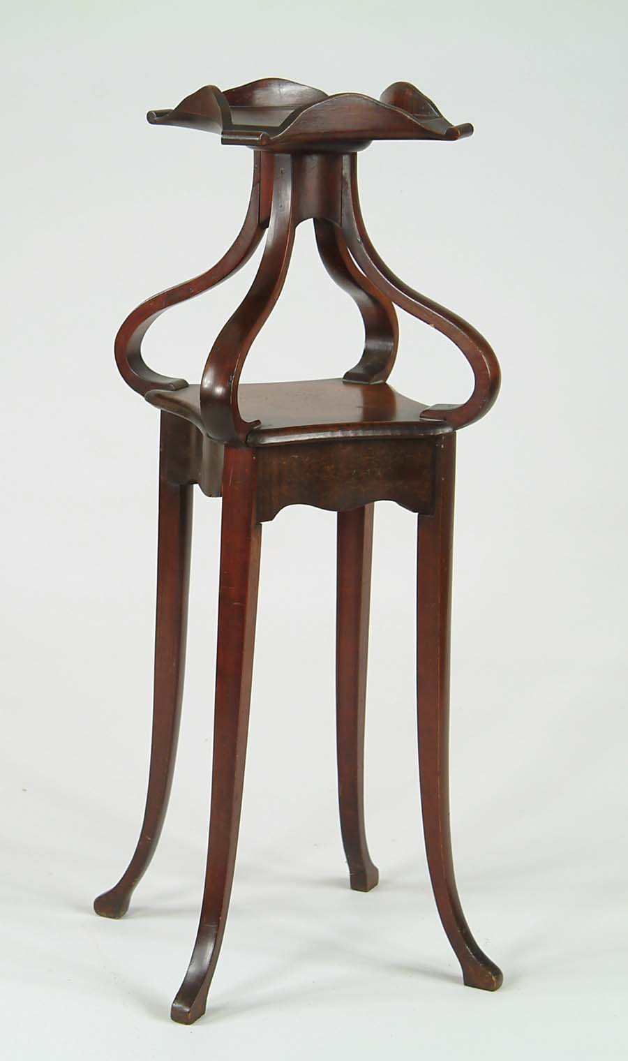 INTERESTING MAHOGANY ART NOUVEAU STYLE STAND. Two tier stand has four scroll arm supports, four tall curving legs. Interesting design and very functional. SIZE: 40” h x 12” sq. maximum. CONDITION: One support has crack at top, some finish wear. Otherwise good. 9-97710 (200-300)
