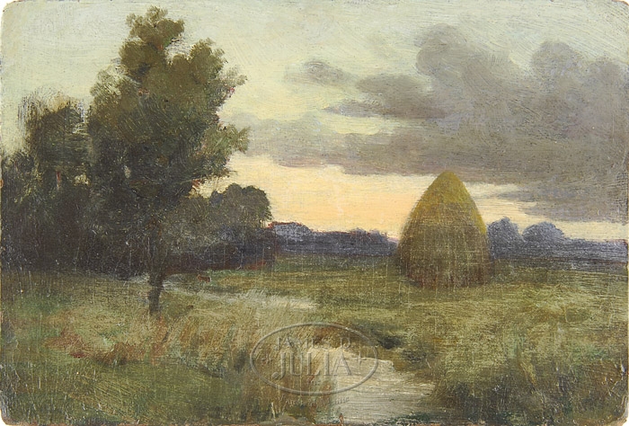 IN THE MANNER OF MARTIN JOHNSON HEADE (American, 1819-1904) MARSH HAYSTACK. Unframed oil on artist board scene shows an early evening landscape with small stream running through a field having haystack and tree. Colorful sunset sky with gray clouds. Unsigned. SIZE: 6″ x 9″. CONDITION: Inpainting, very good. 9-92918 (2,000-3,000)