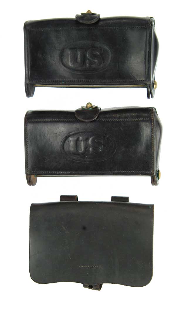 LOT OF 3 CARTRIDGE POUCHES. Two Dyer 1873 pouches, one with Model 1879 tool. Markings on tie downs are unreadable, but one is Rock Island from the shape, the other is probably Watervliet. CONDITION: Very good with cracks in tie downs. One unmarked, two compartment pouch with ** on the reverse. CONDITION: Fine. 4-49537-679 FS285 (150-250)
