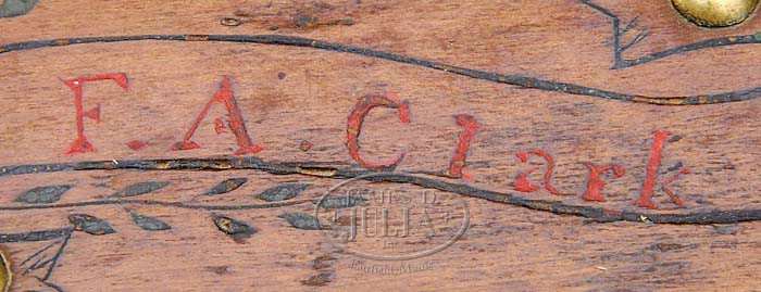 RARE STUDDED, CARVED, AND WAX-DECORATED SAILOR’S BOX. Mid-19th century. The rectangular lid fitted with brass carrying handle and outlined with brass studs, chip-carved with scrolling leafy tendrils above a banner carved with the name “F.A. Clark”, all within a rectangular chip-carved border. The front with similar leafy sprigs flanked by anchors above five-pointed compass stars. The ends decorated with a central chip-carved pinwheel containing hearts and diamonds, each corner carved with a five-pointed compass star. The back faintly painted with the image of a fully rigged sailing ship, the box dovetailed. The carvings all filled with colored sealing wax. SIZE: 7″ h. x 12″ w. x 8″ d. PROVENANCE: Found in the Rockport, Maine area. CONDITION: In very good condition overall, with polished wax surfaces. Showing normal and nominal wear, the painting of ship faded. Lock absent. A nice example of American marine folk art. 9-94188 (3,000-5,000)
