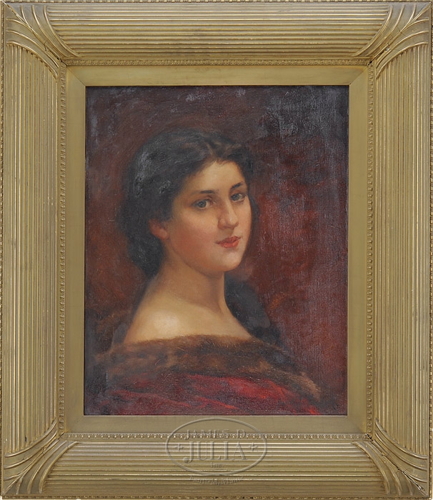MARIE GLON CAMERON (American, 19th/20th Century) “HELENA”. Oil on canvas shoulder length portrait of a young woman with side view with head turned toward viewer. She wears a red dress with mink fur collar and has a reddish/brown background. Signed lower right. Housed in a fine gesso decorated gilt frame with gilt liner which appears to be original. Early label attached to back with title, address and artist. SIZE: 20″ x 16″. PROVENANCE: From a Belfast, Maine home. CONDITION: Craquelure and some discolored varnish. Otherwise very good. 9-92970 (400-600)