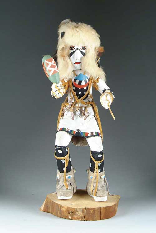 ZUNI KACHINA DOLL “THE DEER DANCER”. Finely painted standing doll has accessories including large rattle, shell necklace and belt. Mounted on a wood slab base. SIZE: 17” h. CONDITION: Appears to have a missing item in his left hand. Otherwise very good. 9-98702 (300-500)