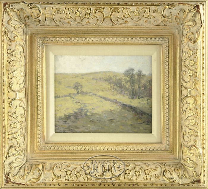 EDWARD LOYAL FIELD (American, NY, 1856-1914) NEW YORK PASTURES. Oil on canvas, laid on hardboard (but not affixed) of impressionistic landscape scene depicting hilly pastures bisected by stone fence. Probably a Catskills or a Hudson River Valley scene, and probably done in the 1880’s or 1890’s. Signed on reverse of canvas. Housed in a reproduction antique-style gilt gesso frame. Ex the Estate of E. L. Field, (Tovar collection number 16A.) Field studied in France under Carolus-Duran. After returning to the U.S., he became a full member of New York’s prestigious Salmagundi Club. SIZE: 7-1/2” x 9-1/4”. CONDITION: Generally very good. 9-27984 (1250-1750)