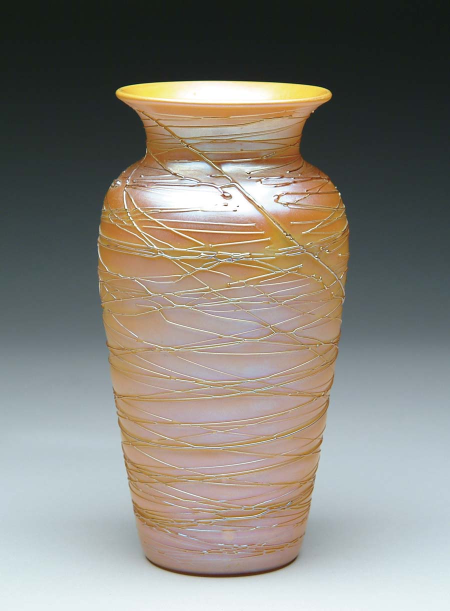 DURAND THREADED VASE. Very nice Durand vase has orange/gold iridescent background, which is decorated with gold iridescent threading. Interior of vase is yellow shading to gold iridescence at the lip. SIZE: 8-1/2 in. t. CONDITION: Very minor loss to threading, otherwise very good to excellent. 5-61042 (600-800)