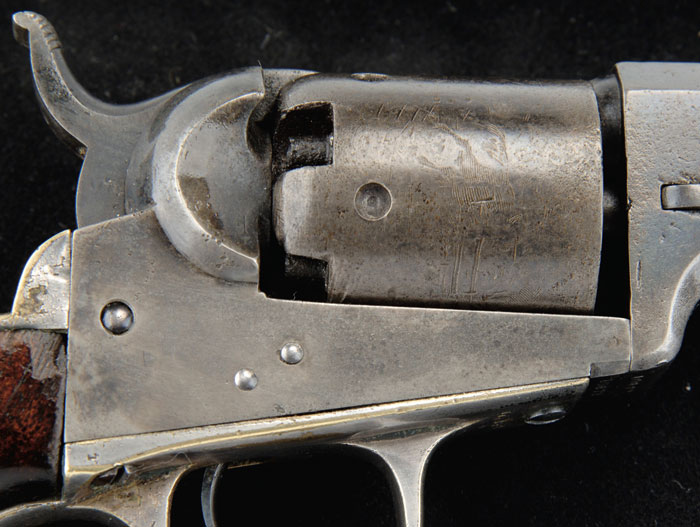 CASED COLT BABY DRAGOON PERCUSSION REVOLVER. Cal. 31. SN 10872. Rare little Colt with 6″ oct bbl, brass pin front sight & 2-line New York City address. It has 5-shot cyl with Ranger/Indian fight scene, silver plated brass grip frame with square back trigger guard & 1-pc walnut grip. Left side of frame is marked “COLT’S PATENT” in tiny letters. Accompanied by a fine, velvet lined, orig Colt casing, green, compartmented in bottom for revolver, a brass Colt’s Patent 2-cavity mold without sprue cutter, a 1-sided eagle flask, an “L” shaped nipple wrench, a tin of Eley’s caps & a packet of combustible cartridges. CONDITION: Fine, all matching including wedge. Bbl retains traces of orig finish in sheltered areas with balance a smooth blue/brown patina with a few scattered pinpoints of rust on left flat. Cyl retains traces of orig finish, being mostly a silver/gray patina with some pitting around front edge and retains 50-60% Indian fight scene. Frame retains 70-80% faded orig case colors & hammer about 50% faded colors. Screws are slightly battered. Trigger guard retains about 80% orig silver & back strap about 30%. Grip has a couple of chipped toes with normal use & handling marks and a chip on right side near frame and retains about 70% orig varnish. Mechanics are fine, strong bore with moderate pitting. Case has a couple of cracks in lid & another in bottom, otherwise has light handling & storage marks and retains most of its orig varnish. Interior is moderately soiled in bottom with damage from front sight and a couple of re-glued panels. Accessories are fine with a repaired seam on flask. 4-59187 (12,000-14,000)