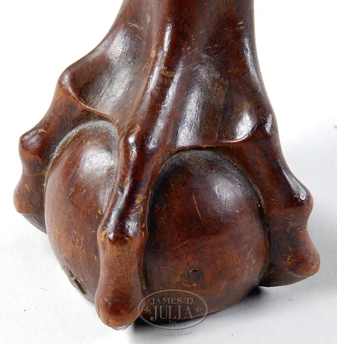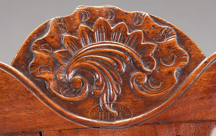 IMPORTANT PHILADELPHIA CARVED CHIPPENDALE WALNUT ARMCHAIR. 3rd quarter 18th century. Originally designed as a convenience chair, the scrolling crest rail centering an asymmetrical carved shell cartouche terminating in flared scrolled chip-carved ears, above the pierced Gothic interwoven splat with scrolled volutes, the shaped serpentine arms with scrolled knuckled grips on incurved supports, centering the trapezoidal slip seat fitted within a deep arcaded rail tenoned through the stiles, raised on bold cabriole frontal legs with shaped returns terminating in ball-and-talon feet, the rear legs faceted and backswept. For a nearly identical example of the treatment of the back of the chair, see 300 Years of American Seating Furniture by Patricia E. Kane, plate 115, pp. 136-137. SIZE: 40-1/2″ h. of back x 27″ overall w. 17-1/4″ h. of seat rail. 18-1/2″ h. of seat. PROVENANCE: From the private collection of a gentleman. CONDITION: With old cleaned surfaces. Back splat with old repairs and restoration in upper third of splat. Proper right front corner of seat rail with old repairs. Front quarter-round glue blocks original and intact; rear glue blocks have been removed along with chamber pot frame. Seat frame appears original; legs and feet with full height. 9-95533 (18,000-22,000)