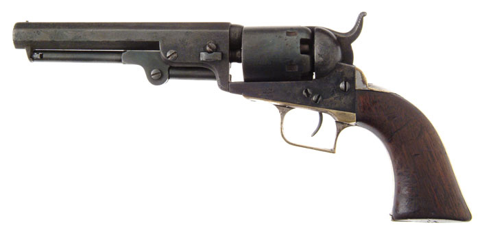 COLT BABY DRAGOON REVOLVER. SN 14100, all matching. 31 Cal. 5” oct bbl. Marked “–ADDRESS SAML COLT / NEW?YORK CITY–” on top of the bbl. “COLTS / PATENT” on the left side of the frame and ‘COLTS PATENT” on the cylinder above the serial number. CONDITION: Brown patina overall with light pitting on the cylinder and moderate pitting at the muzzle. About 60% of the silver remains on the square back triggerguard and the back strap. Grips retain traces of the varnish and are well worn at the base with some dents on the bottom. Traces of the cylinder scene remain. Mechanically good. 4-59049 (4,500-6,000)