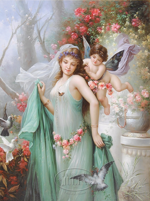 UNSIGNED (Late 20th Century) THE FLOWER MAIDEN. Large unframed oil on canvas exterior scene shows a young maiden in sheer green gown with white sheer head scarf. She is being tended to by several doves carrying flowers and a cherub arranging flowers in her hair. A Classical garden setting is seen with marble pedestal and urn of flowers. A very pleasing decorative painting. SIZE: 40″ x 30″. PROVENANCE: From a Belfast, Maine home. CONDITION: Very good to excellent. 9-92954 (400-600)