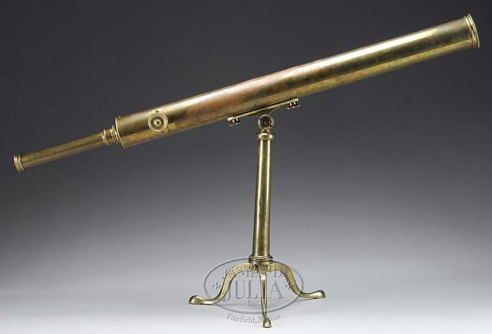 BRITISH BRASS TABLETOP TELESCOPE. 2nd half 19th century. Manufactured by “BROADHURST. CLARKSON & Co. / 63. FARRINGDON Rd. LONDON. E.C.”. This 2-draw brass example accompanied by its original adjustable tripod stand. Stand with folding cabriole legs and pad feet. SIZE: 40″ overall l. (closed). Stand: 17″ h. CONDITION: Very good overall, with one minor dent to outer tube. In need of cleaning. 9-95191 (1,200-1,600)