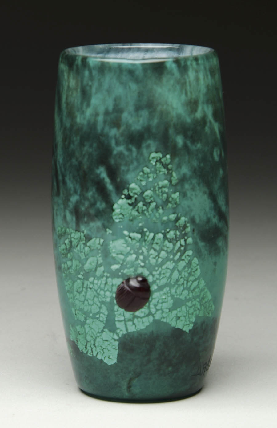 DAUM NANCY VASE. Mottled green glass with a white interior and applied silver mica with an applied three-dimensional scarab. Signed on side of vase “Daum Nancy”. SIZE: 5″ t. CONDITION: Very good to excellent. 5-61935 (500-700)