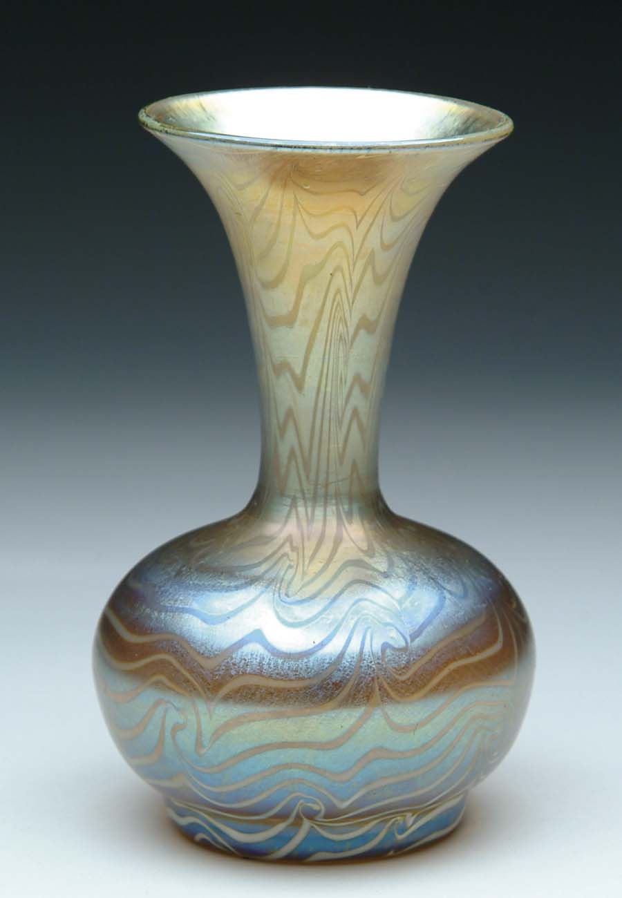 DURAND DECORATED VASE. Lovely Durand vase has white King Tut pattern against a gold iridescent background with wonderful blue iridescent highlights. Interior of vase is brilliant gold iridescence. Bottom of vase has faint remnants of Durand signature. SIZE: 6-3/4 in. t. CONDITION: Very good to excellent. 5-61038 (1,000-1,500)