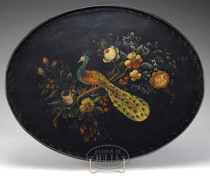 IMPORTANT OVAL TOLE GALLERY TRAY. Mid-19th century. Decorated with a large painted floral spray centering a perching peacock within a border of scrolling gilt leaftips, the pierced gallery with oval grips, all on a black ground. SIZE: 31-1/2″ l. x 24″ w. CONDITION: Very fine overall. With normal craquelure in painted surfaces, more pronounced on body of bird. Underside of tray with small areas of wear and slight rusting. 9-95108 (800-1,200)